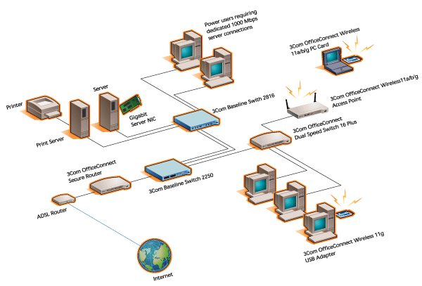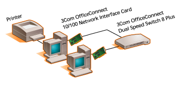 The above network should be familiar to small businesses as it consists of a small number of computers sharing files and a printer. This kind of network is the most basic for small businesses and cost savings can be had because expensive resources like colour laser printers can be shared by many users.